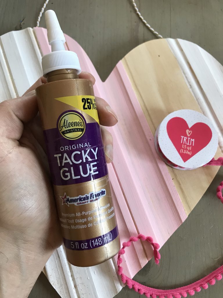 First, I applied the pink pom trim to the edge of the heart using Aleene’s Tacky Glue.