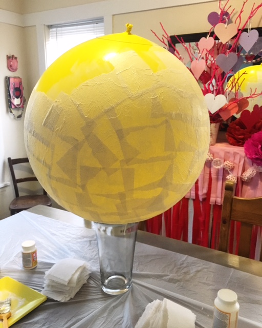 Now the fun begins! I created the surface of the moon using paper towels. I bought a value sized package of choose your size paper towels. For my strips, I chose the smallest size sheet and then ripped that piece into three. I applied the first few layers with Mod Podge and then switched to a homemade papier-mâché paste.